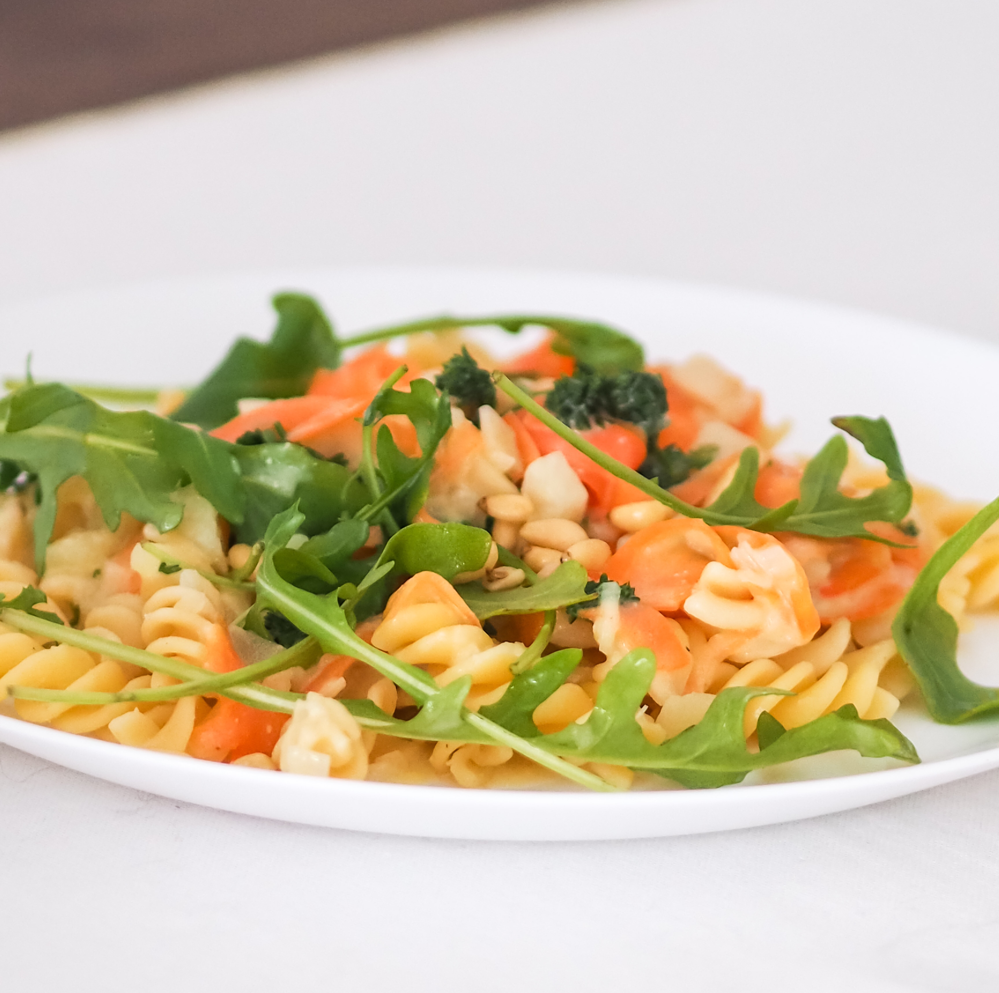 Zuerst kocht ihr die Nudeln. Schneidet das Gemüse klein und bratet es in Olivenöl an. Presst den Knoblauch und gebt ihn der Gemüsemenge dazu. Mischt die Soya Cuisine unter und würzt es mit Salz, Pfeffer und Koriander. Kurz aufkochen und bei niedriger Hitze ziehen lassen. Röstet die Pinienkerne an und wascht den Rucola.