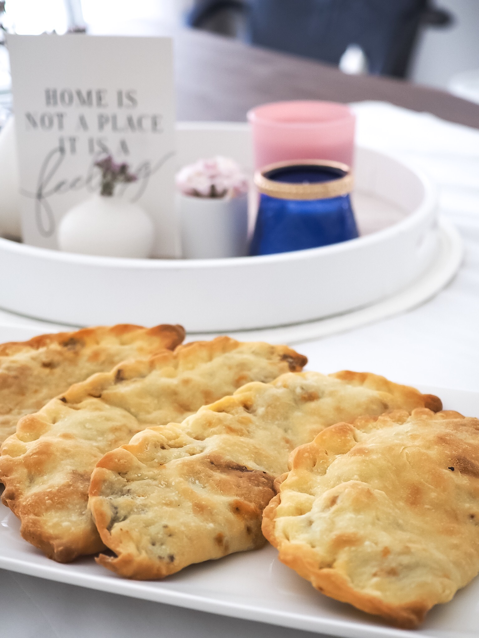 Den Teig zu einer Rolle formen und in Scheiben schneiden. Zu Kugeln formen und ausrollen. Den ausgerollten Teig zur Hälfte mit der Füllung belegen, zusammenklappen und mit einem Messerrücken verschließen.