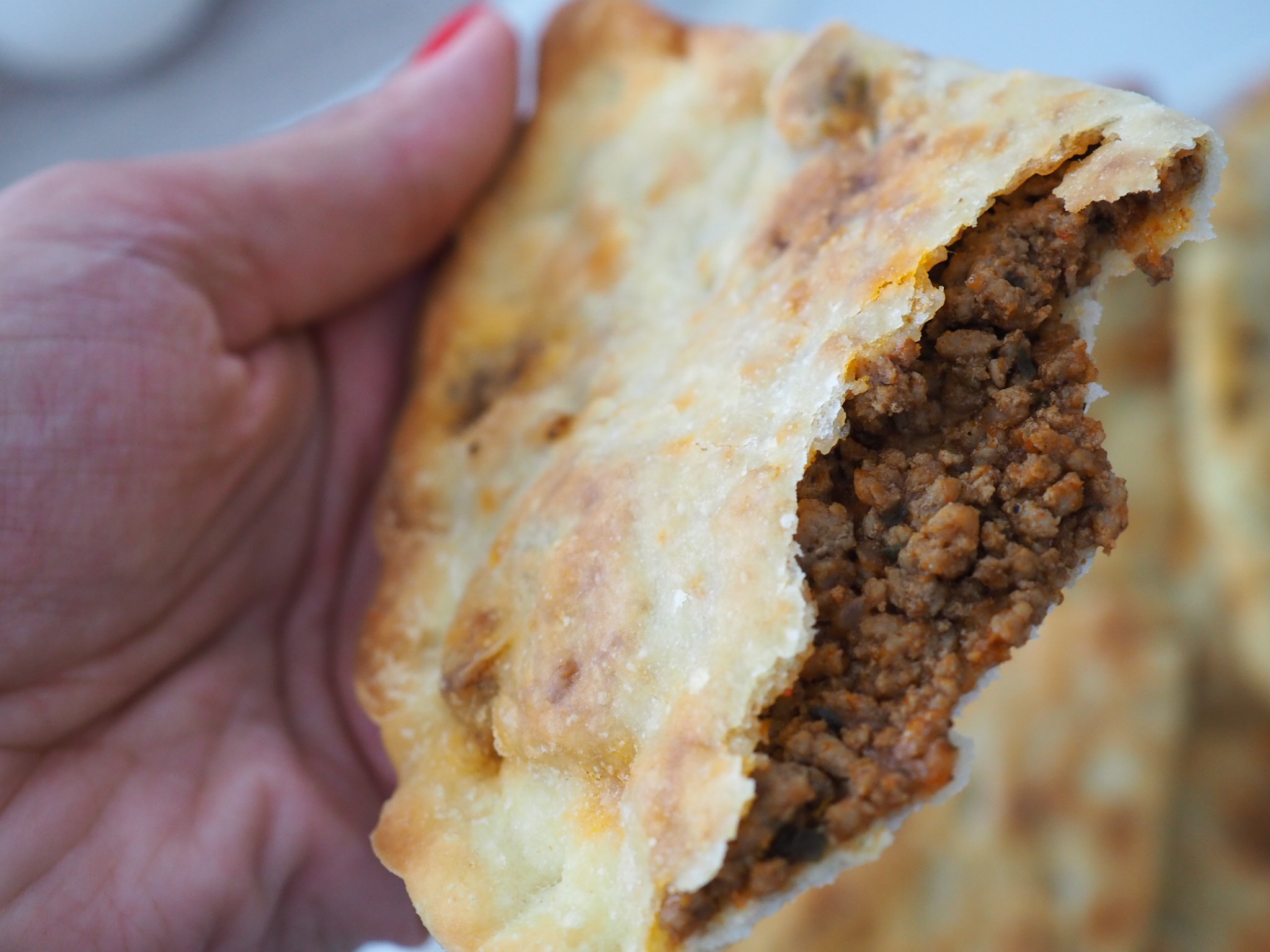 Teig kneten und kurz aufgehen lassen. In der Zwischenzeit bereitet ihr die Füllung vor, dabei bratet ihr erst Hackfleisch, dann Zwiebel an. Tomatenmark, Olivenöl, Tomate, Paprika, Petersilie, Koriander, Salz, schwarzer und roter Pfeffer untermischen und mit anbraten. Köcheln lassen, damit sich die Aromen miteinander vermischen.